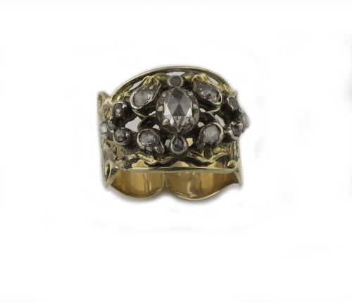 Sortija isabelina con centro calado con diamantes de talla rosa en montura ancha grabada con motivos florales