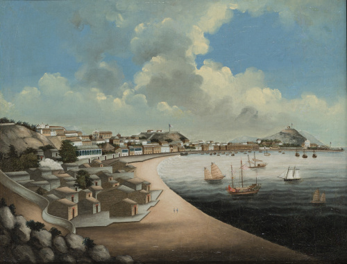ESCUELA CHINA, SEGUNDO CUARTO SIGLO XIXChina. Vista de la Playa grande de Macao desde el campo de Aramitta.