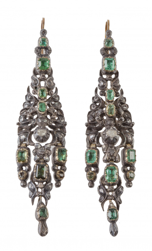 10. Pareja de arracadas de esmeraldas y diamantes S. XVIII con tres cuerpos articulados y esmeraldas cuadradas colgantes
