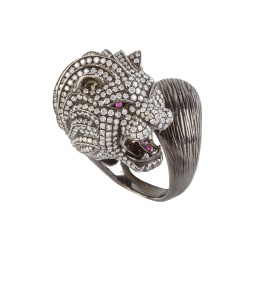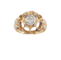 En montura labrada y con brazos calados de oro amarillo de 18K con engaste en garras de plata.