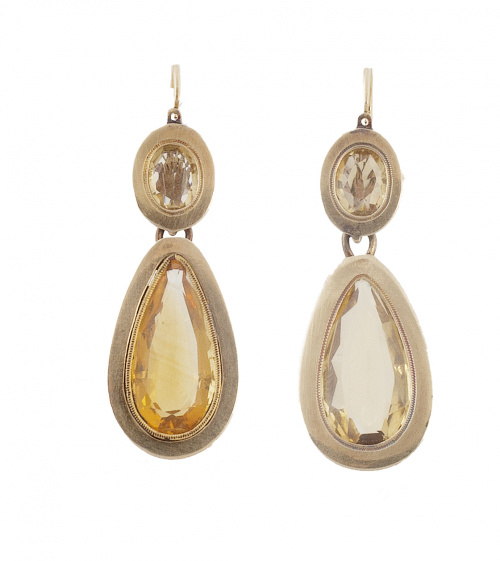 Pendientes largos S. XIX con perilla colgante y botón superior de cuarzos citrinos facetados