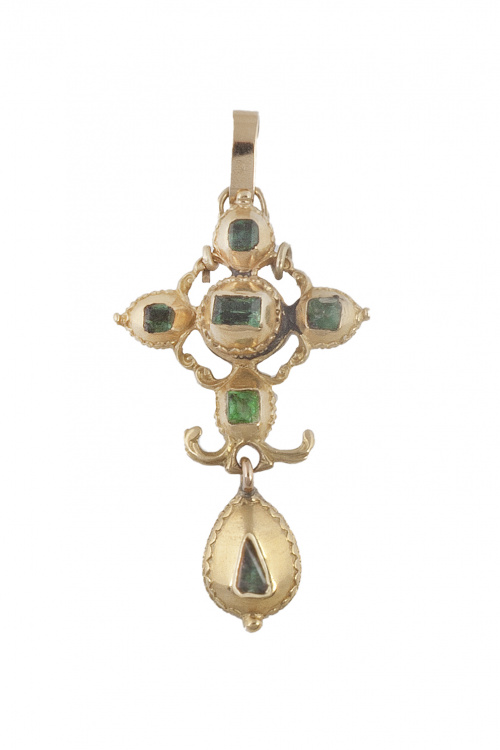 29. Cruz colgante S. XVIII-XIX de esmerlada con perilla de esmeralda colgante