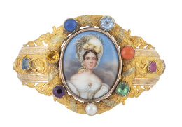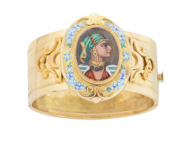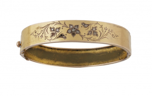37. Brazalete rígido S. XIX con flores de diamantes en aro liso de metal dorado