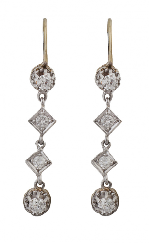 Pendientes largos de pp. S. XX con cuatro brillantes colgantes, dos en garras y los dos centrales enmarcados en rombos