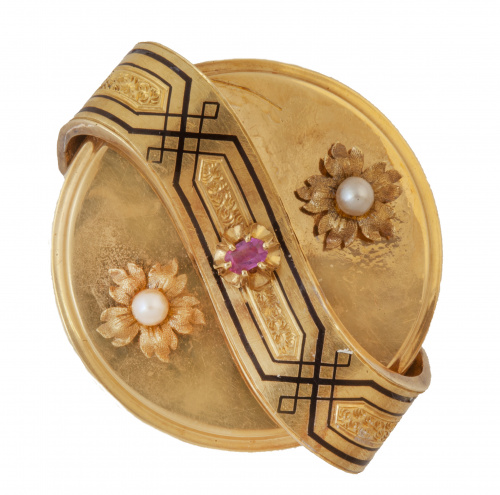 Broche circular S. XIX con dos flores de perlas finas laterales