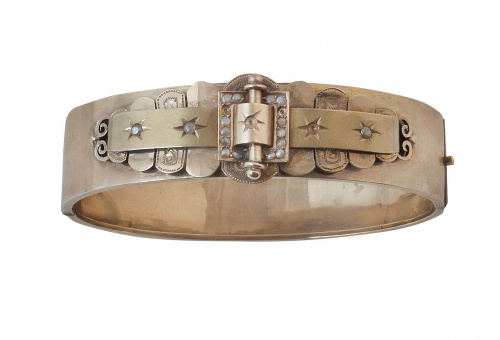 Brazalete rígido pp. S. XX con cierre a modo de hebilla y cinturón de bandas grabadas decorado con perlitas finas