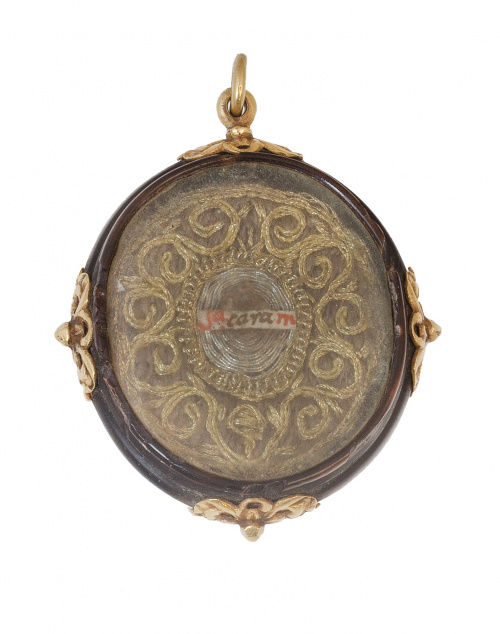 Relicario colgante S.XVII-XVIII con reliquias en anverso y reverso rodeadas por trabajo de hilos de oro entrelazados