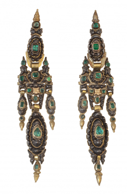 Pareja de arracadas de campanilla S. XVIII-XIX de esmeraldas con tres cuerpos articulados y óvalos colgantes