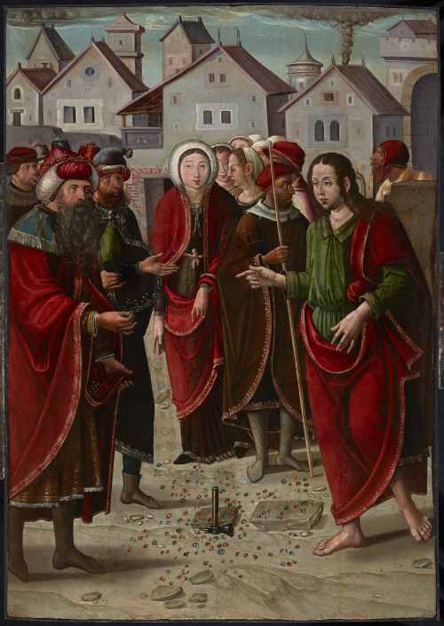 San Juan Evangelista reconstruye unas piedras preciosas ante el filósofo de Cratón, representación basada en la Leyenda Dorada. Tras su destierro en Patmos para escribir el Apocalipsis en Éfeso, San Juan Bautista tiene una serie de incidencias con el filósofo Cratón y sus discípulos, de manera que San Juan se ve obligado a mostrar su poder milagroso recomponiendo unas piedras preciosas destrozadas ante el desafío que le plantea el filósofo. De nuevo el pintor, ha optado por la caracterización de Cratón casi como un rey mago de Oriente. Está vez, la representación de la escena se sitúa en un exterior, prescinde de la naturaleza y nos encontramos ante un paisaje urbano inspirado quizás en alguna estampa del norte de Europa por la proliferación de los tejados a dos aguas, dejando vista la piedra y el ladrillo.