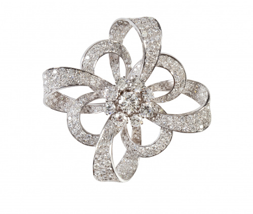 315. Broche años 50 de platino y brillantes, con flor de rosetón "tremblant " central, rodeada de cintas entrelazadas de brillantes