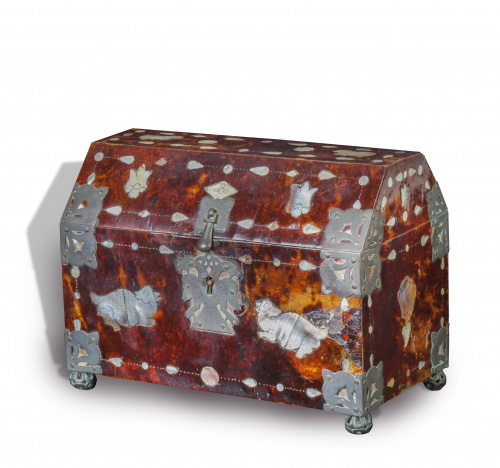 Cofre "enconchado" con tapa a dos aguas, alma de madera de cedro, carey, madreperla y aplicaciones de plata.
