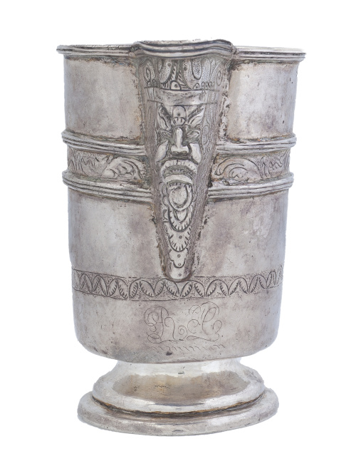 Cuerpo cilíndrico y base plana, sobre pie circular decorado con friso moldurado en relieve con hojas grabadas, el pico en relieve con mascarón masculino y el asa con forma de número 7, rematada en voluta.