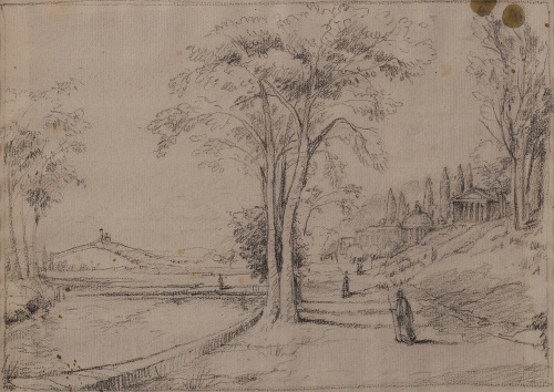Paisaje con figuras y cascasda y Paisaje a las orillas de un río con templetes