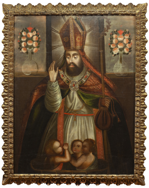 En la obra que presentamos, aparece el Santo casi de cuerpo entero, vestido de pontificial y mostrando los elementos de su dignidad eclesiástica: casulla, báculo y mitra. En la parte inferior, los tres niños desnudos (a quienes devolvió la vida) saliendo de un barril, uno de los episodios más repetidos de la vida del Santo. En la parte superior de la obra dos jarrones de cristal con flores, tan característicos de la escuela cuzqueña.