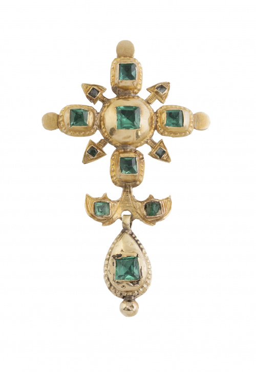 1. Cruz colgante S. XIX-XX con esmeraldas y símil esmeraldas combinadas, en motivo de cruz, lazo y perilla colgante