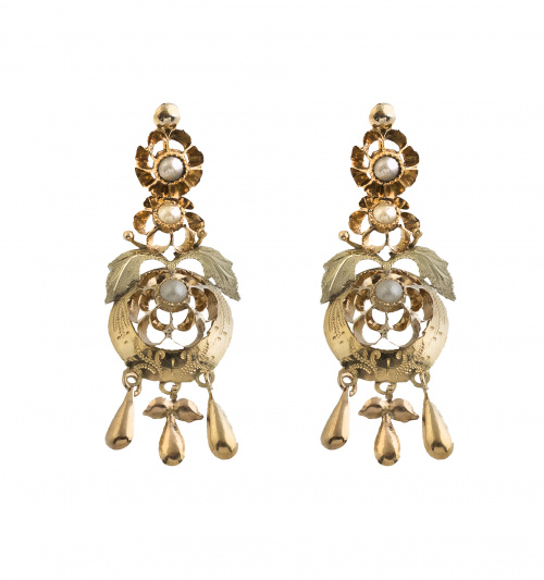 Pendientes largos de pp. S. XX con perlitas de cristal en forma de hojas y flores combinadas