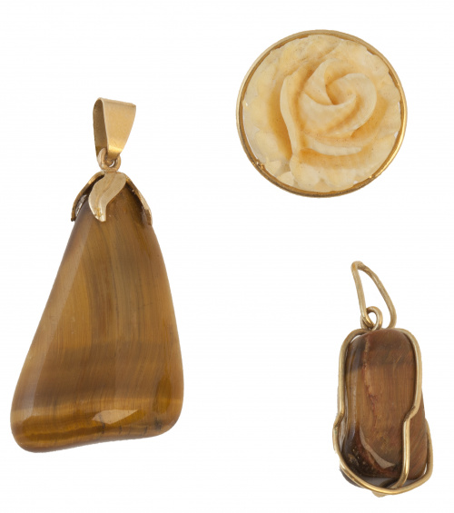 Lote de tres colgantes dos con ojo de tigre y otra con forma de flor tallada en hueso