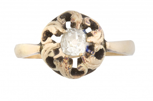 Sortija de pp. S. XX con brillante central de talla antigua en montura elevada labrada con formas vegetales