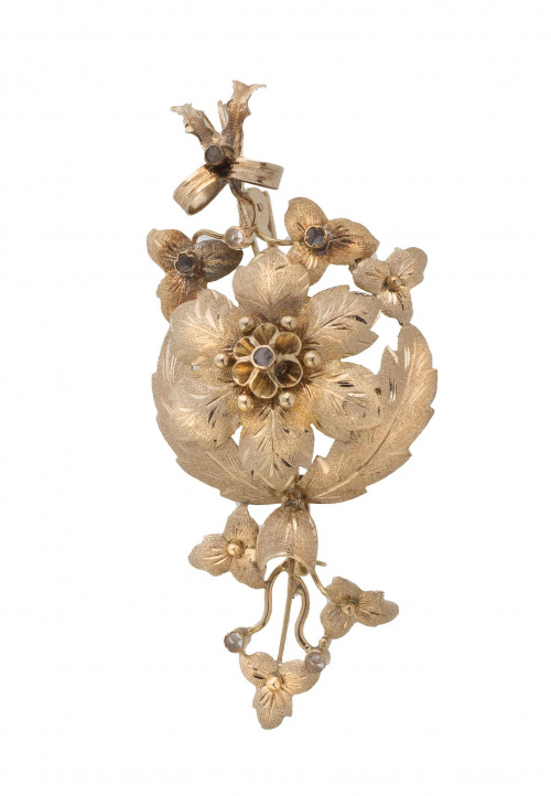 19. Alfiler con diseño floral de diamantes y decoración cincelada y grabada