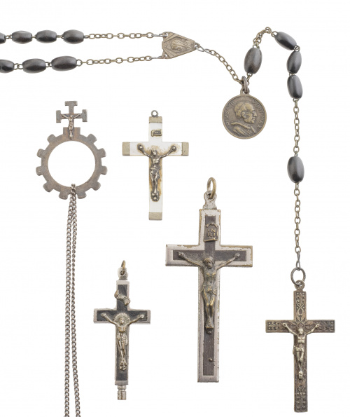 Siete de las medallas en plata y seis en metal. Los rosarios y cruces en metal plateado.