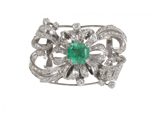 237. Broche años 50 con esmeralda central de intenso color rodeada de diamantes que componen flor central y hojas laterales