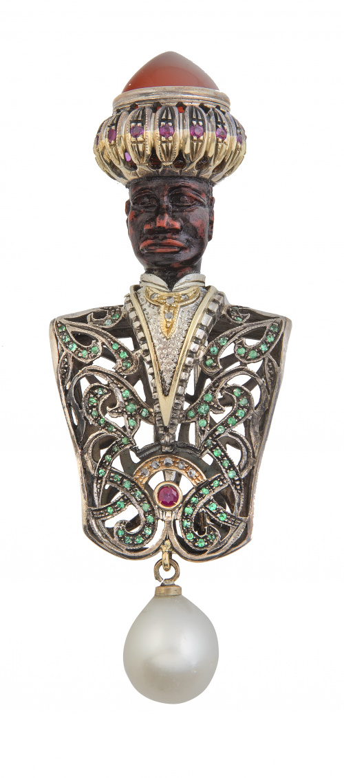 Broche de morito con esmeraldas, rubíes, turbante de ágata cornalina y perla australiana colgante