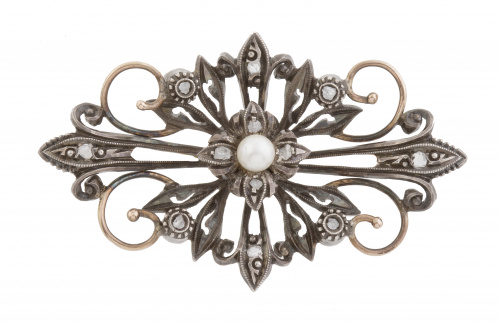 Broche de finales del S. XIX con centro de flor, con perla entre motivos vegetales adornados con diamantes