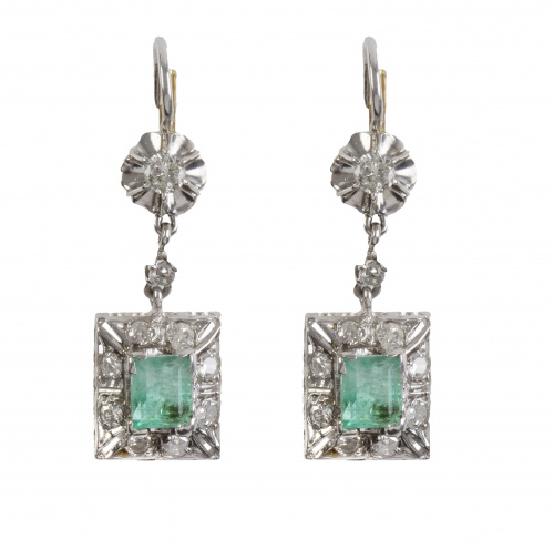 276. Pendientes largos con esmeralda en marco rectangular de brillantes, que penden de dos brillantes superiores