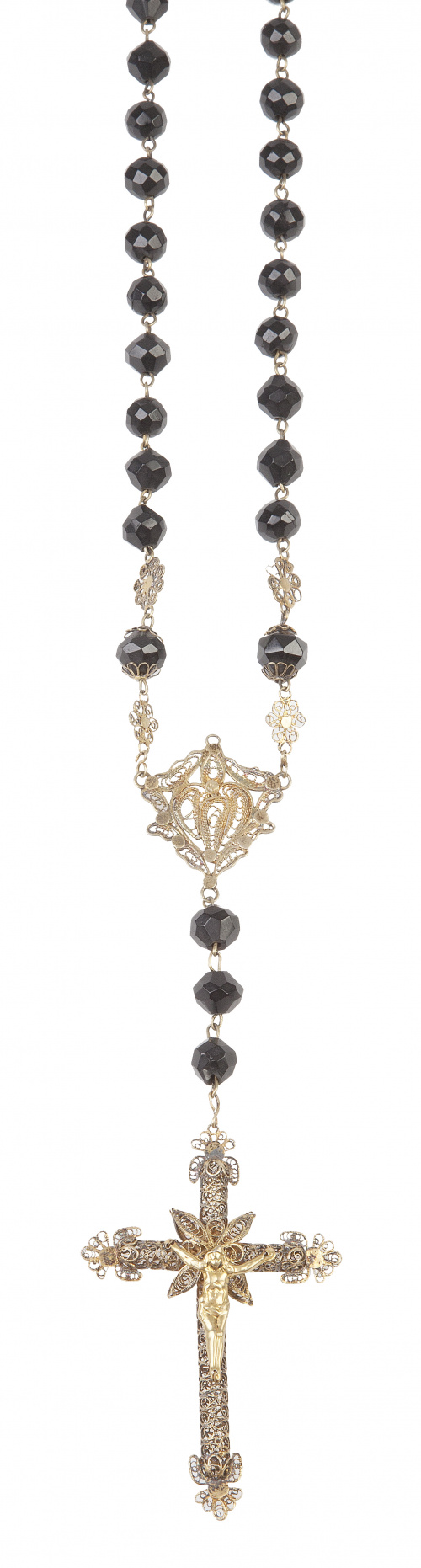 Rosario cuentas de cristal negro facetado y filigrana de plata dorada