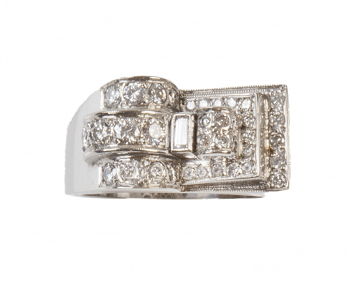 281. Sortija chevalier asimétrica con diseño que combina líneas curvas y rectas con un pequeño cuajado de brilllante y con diamante baguette central
