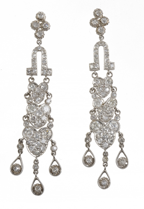 296. Pendientes largos de brillantes Belle-Epoque con piezas principales a modo de corazones lobulados articulados