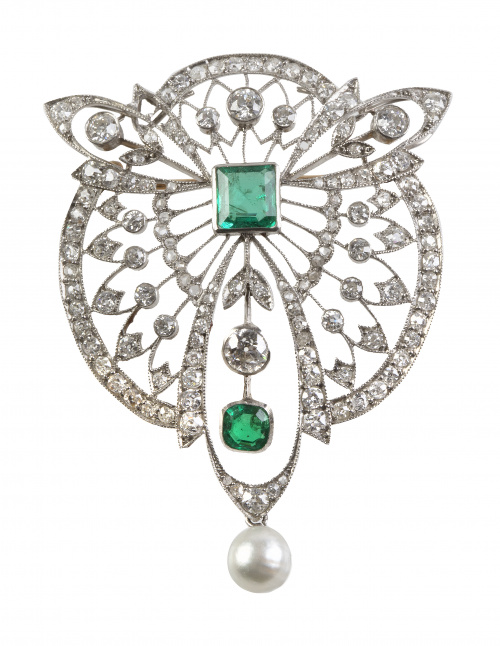 298. Broche Belle-Epoque con delicado diseño calado realizado con esmeraldas, brillantes y perilla de perla fina colgante