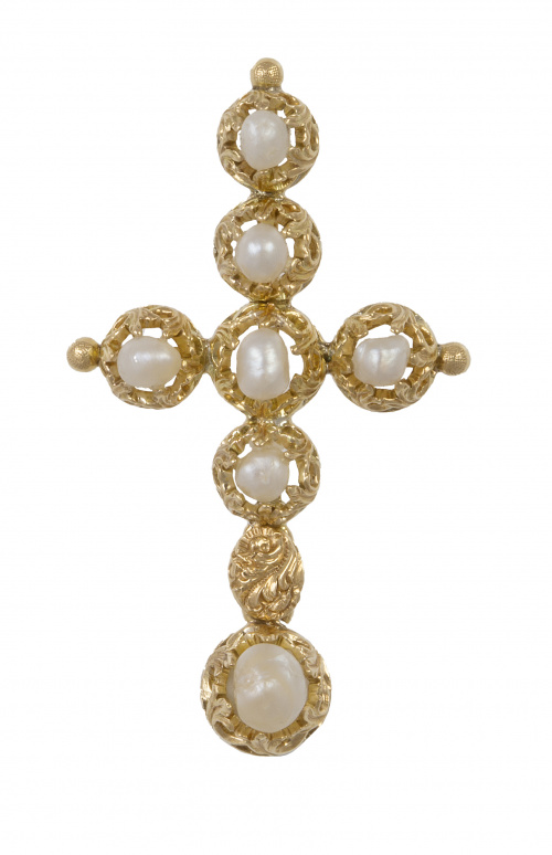 Home / SUBASTA DE JUNIO DE 2021 / Cruz colgante con perlas barrocas en montura labrada y cala