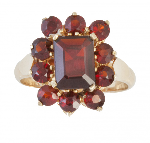 Sortija con granate central de talla rectangular orlado de granates de talla circular