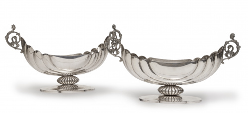 852. Pareja de centros en plata ley 925 con asas con cabezas femeninas.