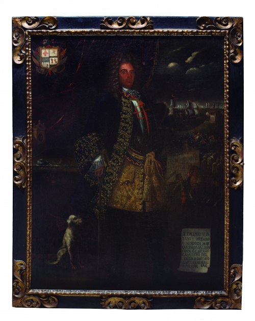 El retrato sigue los parámetros de la nobleza criolla. Con escudo heráldico en la parte superior, aparece retratado de cuerpo entero con peto, casaca y espada. A la izquierda bajo el cortinaje se perciben varios elementos que hablan de su condición social y cultural: un reloj, una brújula, un indígena semioculto bajo la mesa -a modo de atlante, parece-, y un perro. La parte derecha, en cambio, muestra dos escenas: la superior, una batalla naval, quizá con la armada española, y la inferior, donde parece percibirse, junto a distintos militares y un paje que sujeta su caballo -vestidos al modo de la época-, el edificio de la catedral de Popayán.