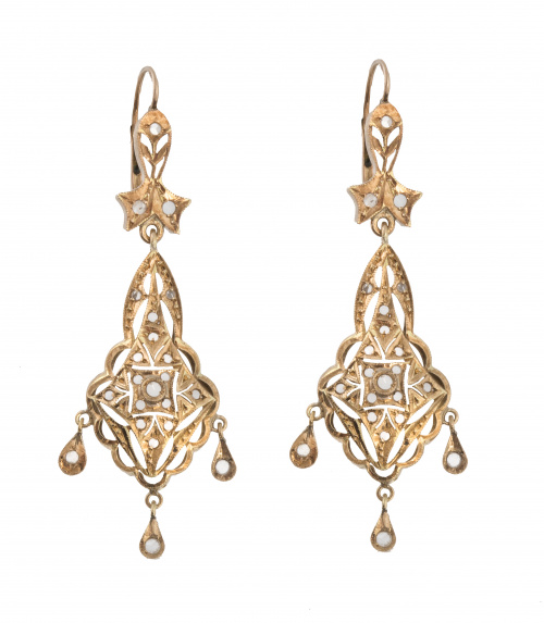11. Pendientes largos de pp. S. XX con forma acampanada calada y zafiros blancos,rematada en tres gotas colgantes