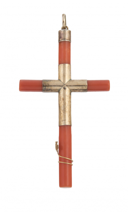 Cruz colgante S. XIX de coral con centro de brazos y montura de colgante en oro