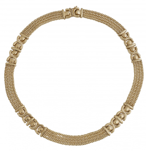 172. Collar de cuatro cordones tubulares unidos en cinco puntos por piezas forma de ochos articuladas