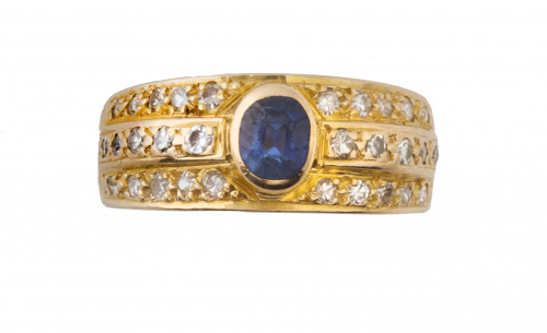 186. Sortija con zafiro azul de talla oval central en montura con tres líneas de brillantes