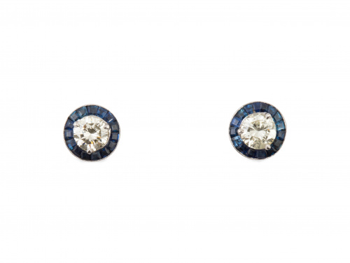 Pendientes ojo de perdiz estilo Art-Decó con brillantes orlados de zafiros calibrados