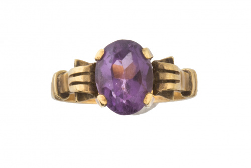Sortija de pp. S. XX con amatista de talla oval en montura con decoración en relieve