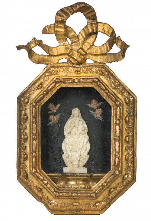 Virgen en marfil tallado, con marco octogonal Carlos IV de madera tallada y dorada.