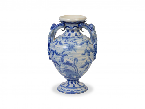 Jarrón de cerámica esmaltada de azul de cobalto. Marcado en la base con el escudo del Monte Carmelo.