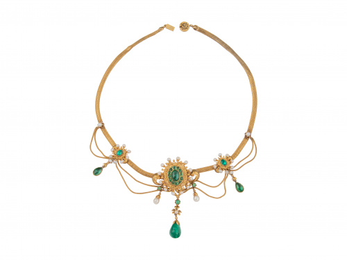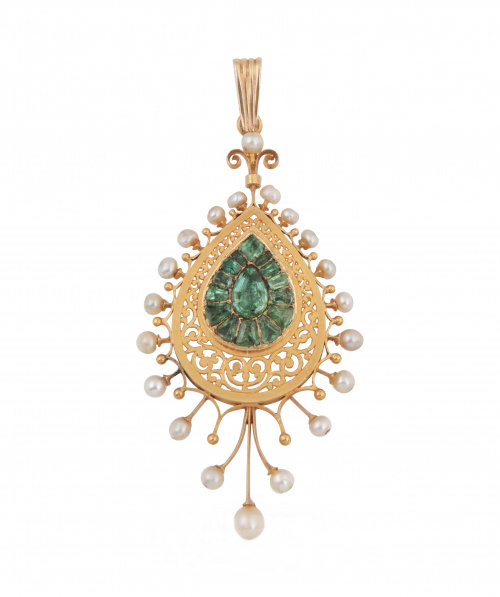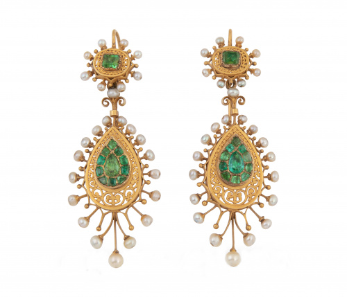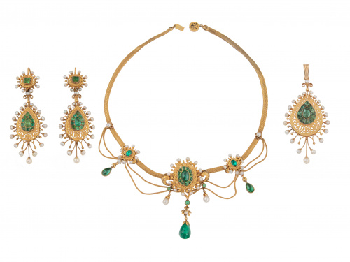 42. Aderezo c.1840 formado por collar pendientes y colgante de perlas finas y esmeraldas, con punzones franceses de exportación