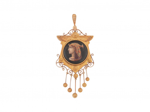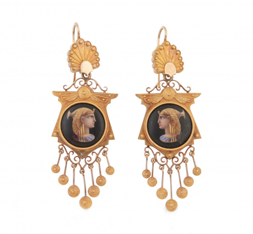 46. Conjunto de broche y pendientes Imperio con figuras egipcias esmaltadas. Con punzones franceses.