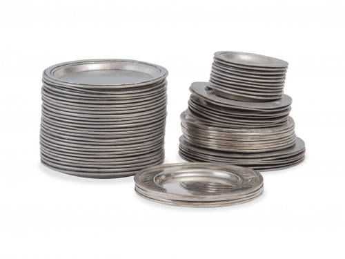Lote de sesenta y dos platitos en estaño de varios tamaños.