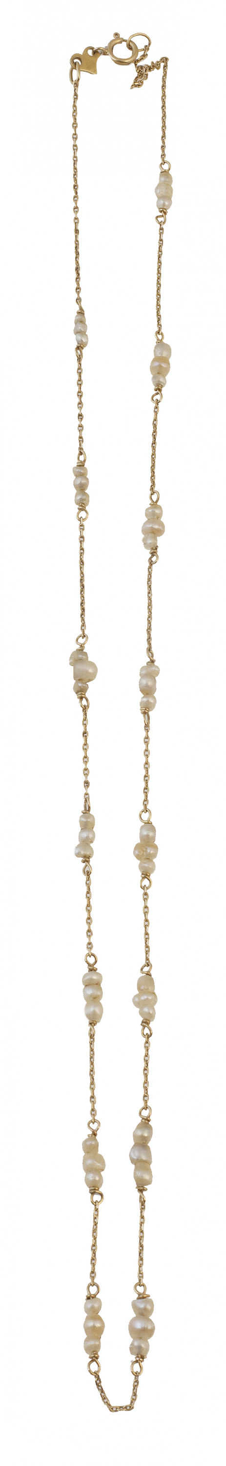 51. Delicada cadena de pp. S. XX con tríos de perlas finas de aljófar entre tramos de fina cadena