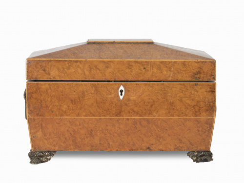 514. Caja de té regencia de madera de raíz marfil y bronce aplicado.