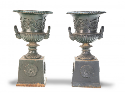 Pareja de copas de jardín de hierro pintadas de verde, S. XX.